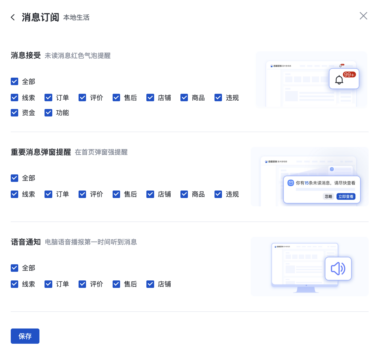 操作方法:可针对『线索、订单、评价、售后、店铺』分别设置是否进行提醒,默认全部开放,可手动登录关闭;此外,同一个店铺下存在主子账号,可by账号设置消息订阅;