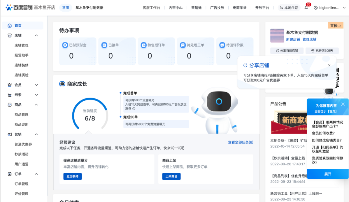 支持店铺在审核中时直接进入平台首页,可同步进行店铺基础信息的设置,加速开店效率;当前店铺的审核状态会在右上角提示【审核中】。